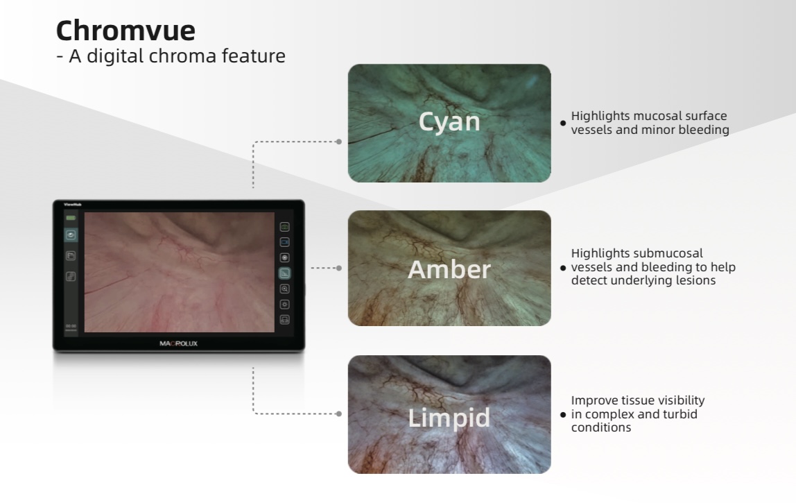 A key highlight was the demonstration of the ViewHub® S13 image processor. Equipped with the proprietary Chromvue® electronic staining function, it offers three distinct modes—Cyan, Amber, and Limpid—to enhance the visualization of mucosal surfaces, submucosal vessels, and bleeding points. This technology aids physicians in identifying lesions within complex or turbid tissue environments, thereby improving diagnostic and procedural accuracy.